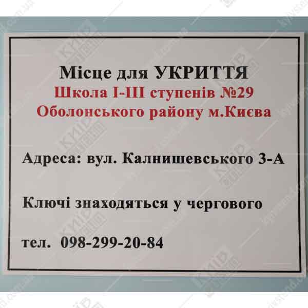 - Стійкість до вологи та ультрафіолету: пластик з ламінацією розрахований на всі природні явища за умови кріплення таблички до стіни будівлі (не на паркан)