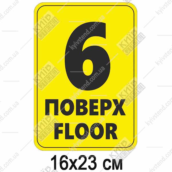 Табличка для 6 этажа на английском пластиковая в контрастном желто-черном цвете, что обычно привлекает внимание. Благодаря ей очень легко будет ориентироваться на лестнице или у лифтов. Эта пластиковая табличка долговечна, устойчива к повреждениям и легко моется любыми моющими средствами. Изображение нанесено способом высококачественной полноцветной печати на пластике, а углы таблички скруглены, что выглядит очень красиво и аккуратно. Табличку с номером этажа размещают на лестнице или возле лифтов, ее очень легко установить в нужном месте на двухсторонний скотч, который уже в комплекте на обратной стороне. Размер таблички стандартный, обычно таблички такого формата удобно использовать в помещениях любого размера.