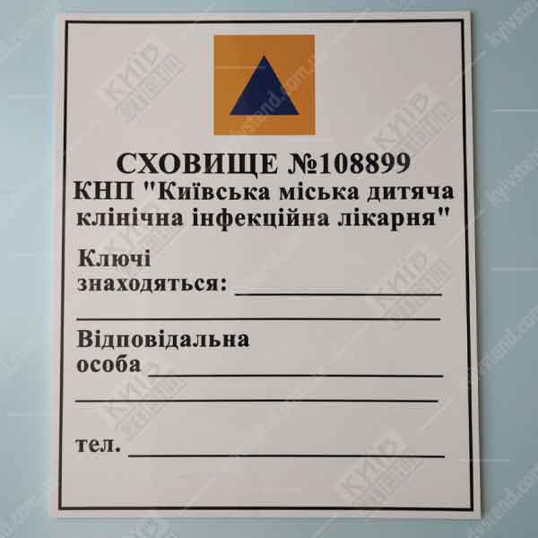 - Место расположения сооружений фонда защитных сооружений обозначаются с помощью табличек (надписей) и указателей движения к ним. У входной двери в защитное сооружение вывешивается табличка размером 50х60 см с указанием номера сооружения, его балансодержателя, мест хранения ключей, лица, ответственного за содержание и эксплуатацию хранилища в мирное время, его местонахождение и номера телефона. В ночное время таблички обозначения защитного сооружения и входы должны быть освещены или дублированы световыми указателями. (Из приказа МВД Украины от 09.07.2018 №579 "Об утверждении требований по вопросам использования и учета фонда защитных сооружений гражданской защиты").