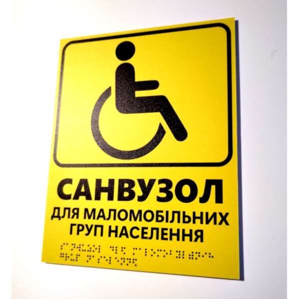Табличка помогает формировать безбарьерную среду в общественных зданиях, так как объединяет пиктограмму, текст и шрифт Брайля. Она делает навигацию понятной для людей с ограниченным зрением и одновременно удобной для других посетителей.