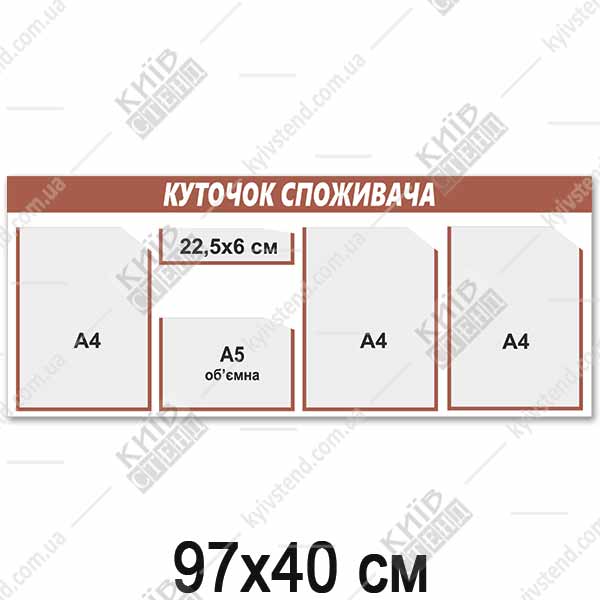 УГОЛ ПОТРЕБИТЕЛЯ длинный - качественный стенд для магазина, ФЛП или организации. Четыре кармана с уникальным размещением в 1 ряд позволяют удобно разместить много необходимой информации. Карманы закреплены на стенде с помощью специального двустороннего скотча и имеют косой вырез в правом верхнем углу. Каждый плоский карман вмещает до 10 листов. Там размещают документы, акции и прейскуранты. Глубина объемного кармана формата А5 составляет 12 мм, что позволяет разместить большое количество документов сразу, а именно законы, порядки, правила продаж. Дополнительный карман размером 22,5 х 6 см предназначен специально для размещения адресов и номеров телефонов органов, обеспечивающих защиту прав потребителей. Такой стенд просто крепится на обычные поверхности с помощью двустороннего скотча, который уже находится на обратной стороне стенда. Также возможно крепление саморезами. Коричневый цвет верхней полосы является универсальным и очень популярным для уголков потребителя. Коричневый цвет в оформлении отлично сочетается с большинством оттенков.